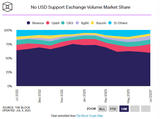 Binance market share at lowest point since beginning of the year. Binance’s market share among exchanges with no USD support has shrunk from 72% at the start of the year to 58%.