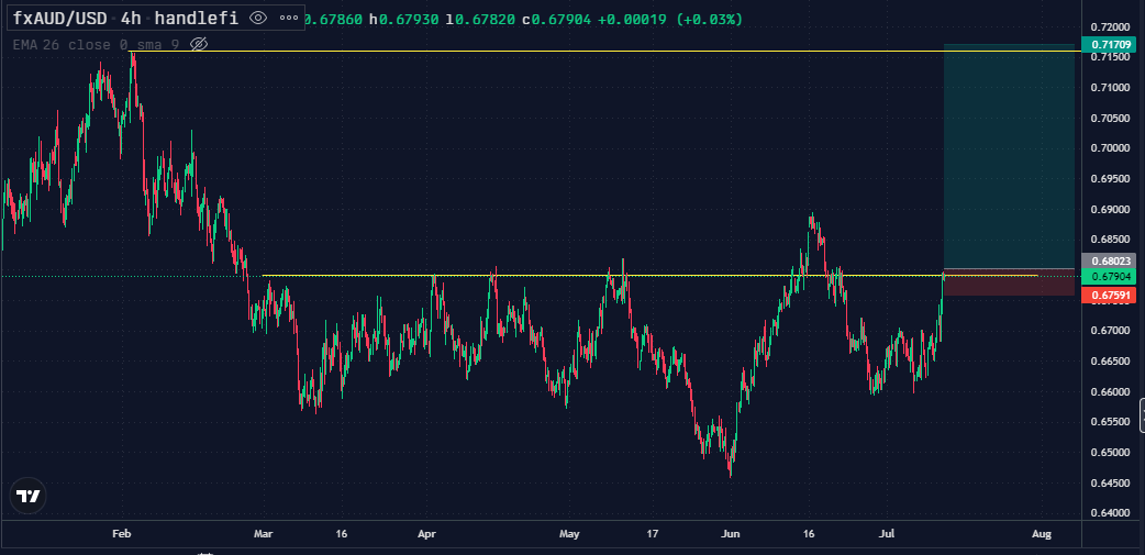 After the bullish CPI results out of the US we are seeing the USD weaken to most currency pairs. The AUD has been strengthening significantly and you could look to play the breakout play above resistance at ~ .68. Possible price to target are local highs at .715 while cutting the trade if it is unable to break out and there is acceptance below the resistance level.